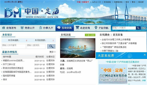 今天(11月11日),“中國·定海”政府門戶網(wǎng)站經(jīng)過改版全新上線,新版涵蓋定海發(fā)布、信息公開、辦事大廳、互動(dòng)交流、走進(jìn)定海、子站導(dǎo)航6大版塊,融入更多新技術(shù)與新元素,增強(qiáng)政府門戶網(wǎng)站的全面性、實(shí)用性、服務(wù)性和規(guī)范性。