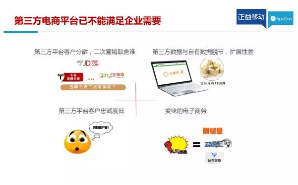 問題來了,移動電商是自建和嫁接?實際上,第三方電商平臺已經(jīng)不能滿足需求。第三方平臺客戶分散、二次營銷取舍難,客戶忠誠度底,用戶往往是平臺的用戶,不是企業(yè)的。此外,變味的電商,刷單才有銷量,要銷量就要刷單,已經(jīng)是惡性循環(huán)。
