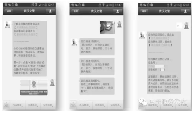 “武漢交警”政務(wù)微信是由武漢交管部門與騰訊大楚網(wǎng)合作開發(fā)完成,其目的在于為武漢超過240萬(wàn)的駕駛員提供更智能的交通服務(wù),進(jìn)而深度解決民生問題,實(shí)行指尖上的政民互動(dòng)?!拔錆h交警”微信平臺(tái)通過1。0版本到3。0版本的不斷系統(tǒng)升級(jí),將其提供的功能從信息推送逐步演化為信息查詢、快速理賠以及最終的微信支付繳納罰款,從而實(shí)現(xiàn)了完整的閉環(huán)式的在線公共服務(wù)。