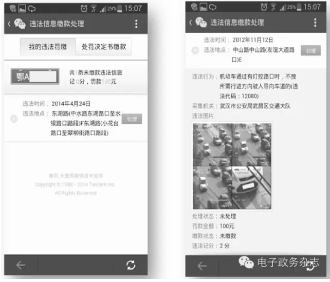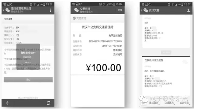 2014年5月26日,由騰訊大楚網(wǎng)與武漢市公安局交通管理局聯(lián)合開發(fā)推出“武漢交警”3。0版本微信支付交通違法罰款功能?!拔錆h交警”成為全國(guó)首例支持微信支付繳納罰單的政務(wù)微信公眾賬號(hào)。用戶關(guān)注“武漢交警”微信公眾賬號(hào)并綁定個(gè)人信息后,當(dāng)車輛出現(xiàn)交通違法現(xiàn)象,就可以及時(shí)收到交管部門主動(dòng)推送的信息提醒,用戶可以通過微信平臺(tái)查詢自己的詳細(xì)違法記錄,包括違法時(shí)間、違法地點(diǎn)、違法行為、采集機(jī)關(guān)、4張不同角度拍攝的違法圖片、罰款金額以及違法記分等信息都會(huì)清晰顯示。在核實(shí)信息后,用戶即可微信支付“處理”罰單,支付成功后,“武漢交警”還會(huì)推送“罰款繳納成功提醒”,包含車主姓名、車牌號(hào)、違法地點(diǎn)、駕駛證扣分情況等,讓車主對(duì)自己的罰單繳納記錄一目了然(參見圖3、圖4)。