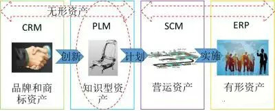 當(dāng)前制造業(yè)企業(yè)中普遍存在著四種主要的資產(chǎn)管理的需求,分別是品牌、商標(biāo)資產(chǎn)、知識(shí)型資產(chǎn)、營(yíng)運(yùn)資產(chǎn)和有形資產(chǎn)。這四種資產(chǎn)在當(dāng)前制造業(yè)從工業(yè)3.0向工業(yè)4.0階段的過(guò)渡時(shí)期對(duì)應(yīng)的信息化管理技術(shù)分別是CRM、PLM、SCM、ERP。