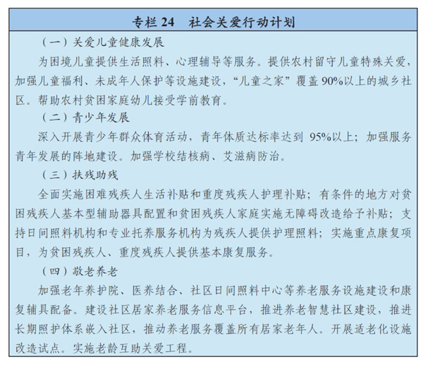 支持殘疾人事業(yè)發(fā)展,建立健全殘疾人基本福利制度,實(shí)現(xiàn)殘疾人基本民生兜底保障。完善重度殘疾人醫(yī)療報(bào)銷制度。優(yōu)先保障殘疾人基本住房。完善殘疾人就業(yè)創(chuàng)業(yè)扶持政策,健全公共機(jī)構(gòu)為殘疾人提供就業(yè)崗位制度。加強(qiáng)殘疾人康復(fù)和托養(yǎng)設(shè)施建設(shè),鼓勵(lì)社會(huì)力量提供服務(wù)。加強(qiáng)殘疾人無(wú)障礙設(shè)施建設(shè)和維護(hù)。實(shí)施0-6歲殘疾兒童康復(fù)、貧困殘疾人基本型輔助器具適配等重點(diǎn)康復(fù)工程。建設(shè)康復(fù)大學(xué),培養(yǎng)康復(fù)專業(yè)技術(shù)人才。