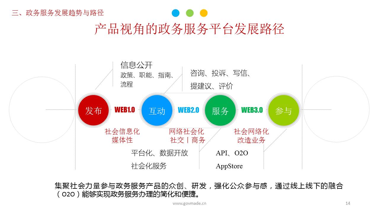 發(fā)展路徑方面,從1.0以信息發(fā)布為主到2.0時(shí)代以互動(dòng)交流為主到3.0的服務(wù)創(chuàng)新,到4.0階段我們?nèi)绾巫尨蟊妱?chuàng)新,直接來(lái)眾創(chuàng)、眾籌、眾智的方式來(lái)突破公眾參與感,是我們發(fā)展路徑里面的最后一個(gè)路徑。如何來(lái)集中社會(huì)力量,參與政務(wù)服務(wù)的眾創(chuàng)與研發(fā)來(lái)強(qiáng)化公眾參與感,通過(guò)線上線下的融合(O2O)的方式來(lái)實(shí)現(xiàn)政務(wù)服務(wù)辦理的簡(jiǎn)化和便捷,這是我們的第四個(gè)路徑。