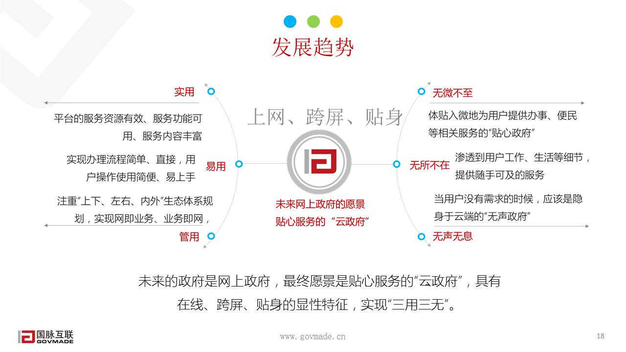 發(fā)展趨勢(shì)方面,我們特別提出了未來(lái)的政府是網(wǎng)上政府,最終愿景是貼心服務(wù)的“云政府”,具有在線、跨屏、貼身的顯性特征,實(shí)現(xiàn)“三無(wú)三用”:"三無(wú)"是無(wú)微不至、無(wú)所不在、無(wú)聲無(wú)息;我先要政府的時(shí)候,政府就在我身邊,我不想找政府的時(shí)候,政府就不在,就叫無(wú)聲無(wú)息,無(wú)所不在;那么"三用"是實(shí)用、易用、管用,這個(gè)是對(duì)發(fā)展趨勢(shì)我們提出的未來(lái)發(fā)展。