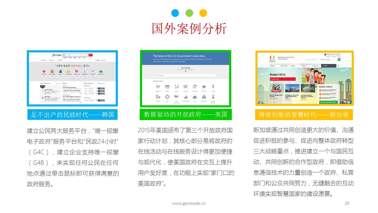 政府轉(zhuǎn)型方面,從李克強(qiáng)總理在“互聯(lián)網(wǎng)+政務(wù)服務(wù)”提出到政府工作報(bào)告中"大力推行'互聯(lián)網(wǎng)+',實(shí)現(xiàn)部門(mén)間數(shù)據(jù)共享,讓居民和企業(yè)少跑腿、好辦事、不添堵",怎樣為老百姓提供更大的服務(wù)和建設(shè)化服務(wù)是最重要的;