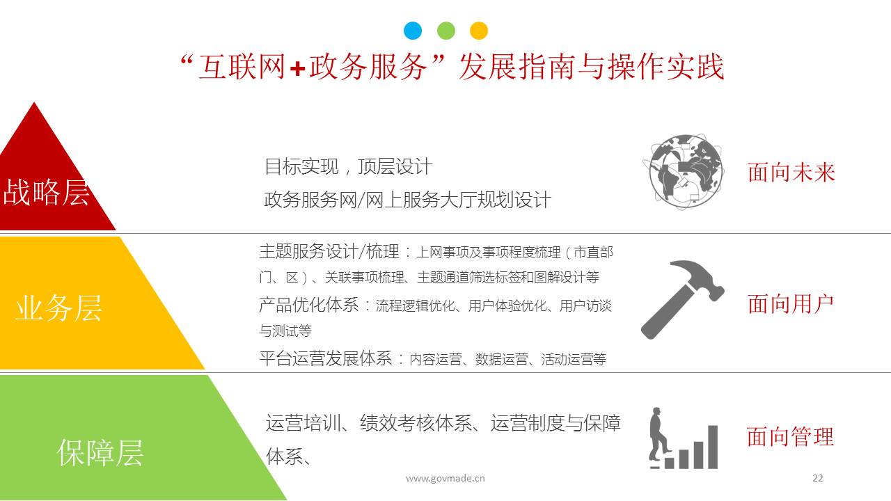 建設(shè)體系方面,我們研究了比較長(zhǎng)時(shí)間,基于浙江省和江西省政府服務(wù)大廳、上海市政府大廳、徐匯區(qū)行政服務(wù)中心和網(wǎng)上辦事大廳、廈門(mén)市包括海滄區(qū)的行政服務(wù)中心的研究,我們提出了三個(gè)層面:做好統(tǒng)籌全局的戰(zhàn)略設(shè)計(jì)、打造全方位業(yè)務(wù)融合層、建立多角度保障支撐層,具體如下圖。