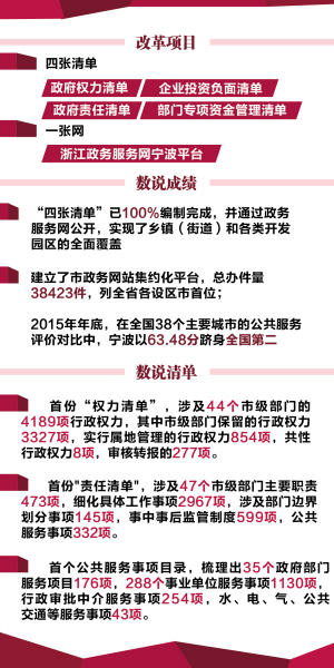 2014年,全省開始以“四張清單一張網(wǎng)”為重點的政府自身改革。作為改革前沿陣地的寧波,自然是一馬當(dāng)先,全力推進(jìn)政府權(quán)力清單、企業(yè)投資負(fù)面清單、政府責(zé)任清單、部門專項資金管理清單及浙江政務(wù)服務(wù)網(wǎng)寧波平臺的建設(shè)。