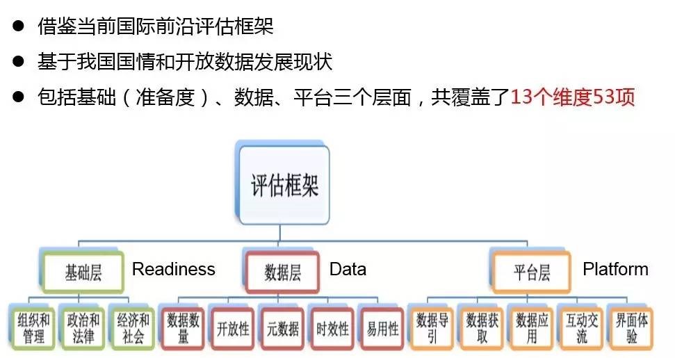 鄭磊介紹,這種從政府端進(jìn)行的評(píng)估包括三部分:在基礎(chǔ)層,包括經(jīng)濟(jì)、社會(huì)、組織、管理、人員能力等方面的準(zhǔn)備;在平臺(tái)層,包括平臺(tái)做得如何、用戶體驗(yàn)如何,獲取數(shù)據(jù)是否容易等;在基礎(chǔ)層、平臺(tái)層之上的數(shù)據(jù)層,是真正開(kāi)放出來(lái)的“干貨”,包括開(kāi)放數(shù)據(jù)的數(shù)量、格式、標(biāo)準(zhǔn)等。