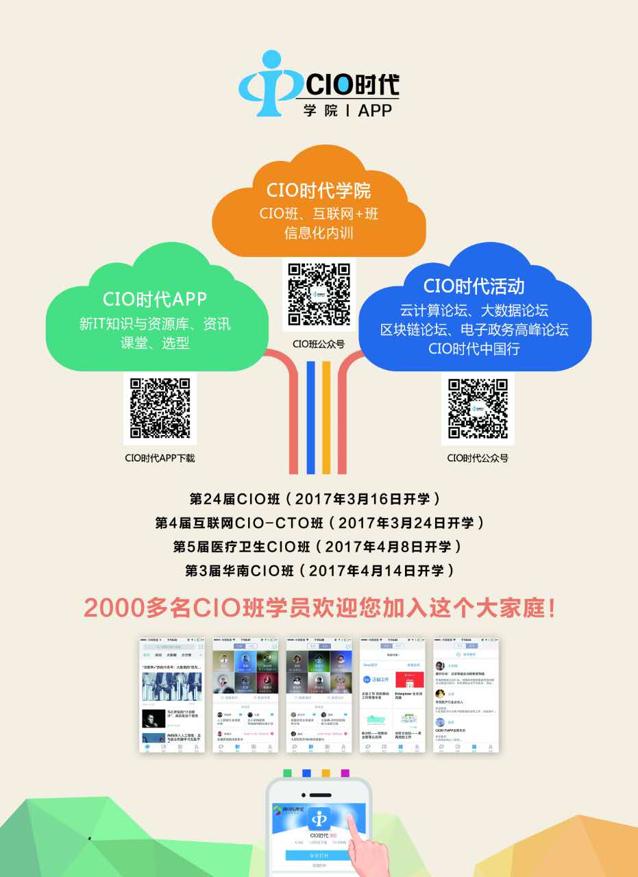 CIO時代成立于2003年,由當(dāng)時北大CIO論壇骨干創(chuàng)辦,也是北大科技園創(chuàng)業(yè)中心成立時從北大校內(nèi)征集的第一批孵化項目。自2005年北大CIO班開辦之后,CIO時代一直作為北大CIO班的唯一合作辦學(xué)單位。目前,受國家相關(guān)政策影響,北大CIO班停辦之后,CIO時代啟動了CIO時代學(xué)院,繼續(xù)開展CIO培訓(xùn)。目前CIO時代學(xué)院開辦的CIO班包括每年2屆的普通CIO班,還包括醫(yī)療衛(wèi)生CIO班、政府CIO班、金融CIO班、互聯(lián)網(wǎng)CIO-CTO班等行業(yè)CIO班,另外還有華南CIO班、福建國資CIO班等地區(qū)CIO班。在聚集了幾千個學(xué)員資源的基礎(chǔ)上,CIO時代也開始致力于自身的轉(zhuǎn)型,希望通過移動APP繼續(xù)為學(xué)員提供隨時隨地的在線學(xué)習(xí),把CIO班變成一個永不畢業(yè)的班級,同時也為IT業(yè)內(nèi)人士提供一個資源對接和交流的平臺。