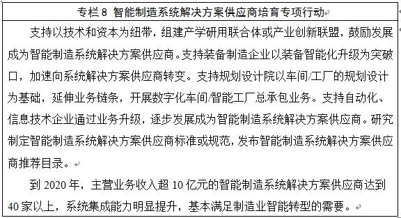 --智能制造生態(tài)體系初步形成。培育40個(gè)以上主營業(yè)務(wù)收入超過10億元、具有較強(qiáng)競爭力的系統(tǒng)解決方案供應(yīng)商,智能制造人才隊(duì)伍基本建立。