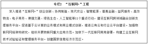 (二)推進“互聯(lián)網(wǎng)+”行動。促進新一代信息技術(shù)與經(jīng)濟社會各領(lǐng)域融合發(fā)展,培育“互聯(lián)網(wǎng)+”生態(tài)體系。