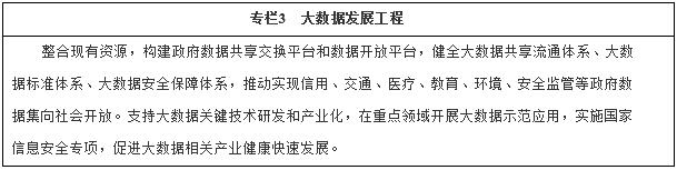 (三)實施國家大數(shù)據(jù)戰(zhàn)略。落實大數(shù)據(jù)發(fā)展行動綱要,全面推進重點領(lǐng)域大數(shù)據(jù)高效采集、有效整合、公開共享和應用拓展,完善監(jiān)督管理制度,強化安全保障,推動相關(guān)產(chǎn)業(yè)創(chuàng)新發(fā)展。