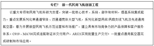 (二)實現(xiàn)航空產(chǎn)業(yè)新突破。加強自主創(chuàng)新,推進民用航空產(chǎn)品產(chǎn)業(yè)化、系列化發(fā)展,加強產(chǎn)業(yè)配套設施和安全運營保障能力建設,提高產(chǎn)品安全性、環(huán)保性、經(jīng)濟性和舒適性,全面構(gòu)建覆蓋航空發(fā)動機、飛機整機、產(chǎn)業(yè)配套和安全運營的航空產(chǎn)業(yè)體系。到2020年,民用大型客機、新型支線飛機完成取證交付,航空發(fā)動機研制實現(xiàn)重大突破,產(chǎn)業(yè)配套和示范運營體系基本建立。