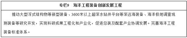 加快發(fā)展新型海洋工程裝備。突破浮式鉆井生產(chǎn)儲卸裝置、浮式液化天然氣儲存和再氣化裝置、深吃水立柱式平臺、張力腿平臺、極地鉆井平臺、海上試驗場等研發(fā)設計和建造技術(shù),建立規(guī)?;a(chǎn)制造工藝體系,產(chǎn)品性能及可靠性達到國際先進水平。