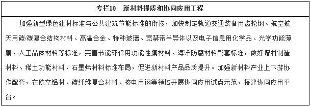 (六)提高新材料基礎(chǔ)支撐能力。順應新材料高性能化、多功能化、綠色化發(fā)展趨勢,推動特色資源新材料可持續(xù)發(fā)展,加強前沿材料布局,以戰(zhàn)略性新興產(chǎn)業(yè)和重大工程建設需求為導向,優(yōu)化新材料產(chǎn)業(yè)化及應用環(huán)境,加強新材料標準體系建設,提高新材料應用水平,推進新材料融入高端制造供應鏈。到2020年,力爭使若干新材料品種進入全球供應鏈,重大關(guān)鍵材料自給率達到70%以上,初步實現(xiàn)我國從材料大國向材料強國的戰(zhàn)略性轉(zhuǎn)變。