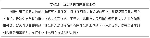 (一)構(gòu)建生物醫(yī)藥新體系。加快開發(fā)具有重大臨床需求的創(chuàng)新藥物和生物制品,加快推廣綠色化、智能化制藥生產(chǎn)技術(shù),強化科學高效監(jiān)管和政策支持,推動產(chǎn)業(yè)國際化發(fā)展,加快建設生物醫(yī)藥強國。