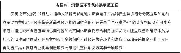 (五)深入推進資源循環(huán)利用。樹立節(jié)約集約循環(huán)利用的資源觀,大力推動共伴生礦和尾礦綜合利用、“城市礦產(chǎn)”開發(fā)、農(nóng)林廢棄物回收利用和新品種廢棄物回收利用,發(fā)展再制造產(chǎn)業(yè),完善資源循環(huán)利用基礎(chǔ)設施,提高政策保障水平,推動資源循環(huán)利用產(chǎn)業(yè)發(fā)展壯大。到2020年,力爭當年替代原生資源13億噸,資源循環(huán)利用產(chǎn)業(yè)產(chǎn)值規(guī)模達到3萬億元。