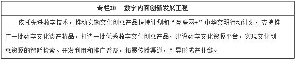 鼓勵創(chuàng)作當代數(shù)字創(chuàng)意內(nèi)容精品。強化高新技術(shù)支撐文化產(chǎn)品創(chuàng)作的力度,提高數(shù)字創(chuàng)意內(nèi)容產(chǎn)品原創(chuàng)水平,加快出版發(fā)行、影視制作、演藝娛樂、藝術(shù)品、文化會展等行業(yè)數(shù)字化進程,提高動漫游戲、數(shù)字音樂、網(wǎng)絡文學、網(wǎng)絡視頻、在線演出等文化品位和市場價值。鼓勵多業(yè)態(tài)聯(lián)動的創(chuàng)意開發(fā)模式,提高不同內(nèi)容形式之間的融合程度和轉(zhuǎn)換效率,努力形成具有世界影響力的數(shù)字創(chuàng)意品牌,支持中華文化“走出去”。
