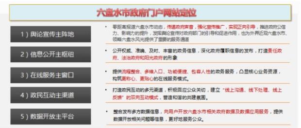 六盤水市政府網(wǎng)站定位結(jié)合了政府網(wǎng)站功能要求、市政府主要領(lǐng)導(dǎo)對網(wǎng)站建設(shè)期待以及地方特色,擬定為:輿論宣傳主陣地、信息公開主樞紐、在線服務(wù)主窗口、政民互動主渠道、數(shù)據(jù)開放主平臺。
