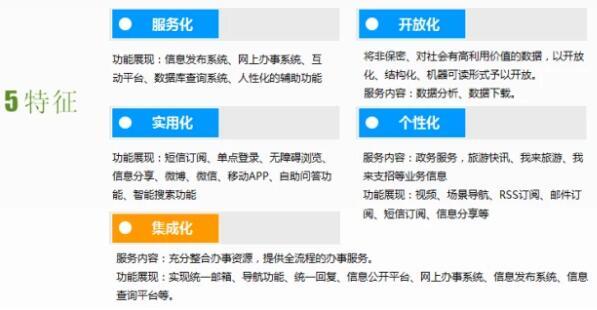 新版政府網(wǎng)站定位體現(xiàn)了服務(wù)化、開放化、實(shí)用化、個(gè)性化、集成化的五種特征。