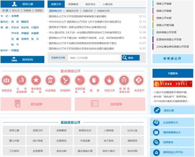 政務(wù)頻道根據(jù)國家和貴州省相關(guān)政策文件要求,建立政府信息公開專欄,推進(jìn)領(lǐng)導(dǎo)之窗、政府機(jī)構(gòu)、政策文件等基礎(chǔ)信息公開,加強(qiáng)財(cái)政資金、公共資源配置、重大建設(shè)項(xiàng)目、社會救助、權(quán)力清單、責(zé)任清單等重點(diǎn)領(lǐng)域信息公開,保障公眾知情、參與和監(jiān)督權(quán),充分發(fā)揮政府網(wǎng)站窗口作用。