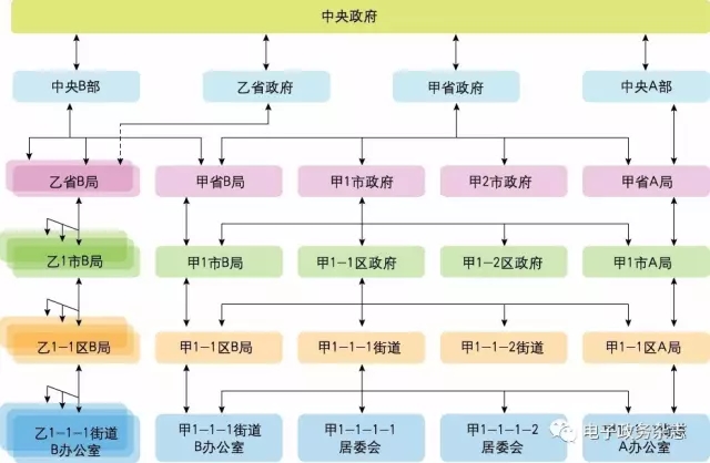 A類共享需要“跨地域橫向共享平臺(tái)+跨部門(mén)橫向共享平臺(tái)+部門(mén)內(nèi)跨層級(jí)縱向共享平臺(tái)”才能實(shí)現(xiàn)。在本事例中,需要在江西的街道派出所和北京旅游局之間實(shí)現(xiàn)信息共享,如圖1所示,相當(dāng)于“乙1-1-1街道B辦公室”的信息要達(dá)到“甲省A局”,其可能的路徑有多條,以通過(guò)政府機(jī)構(gòu)數(shù)量為依據(jù),最短的三條路徑是:①乙1-1-1街道B辦公室→乙1-1區(qū)B局→乙1市B局→乙省B局→中央B部→省B局→甲省政府→甲省A局;②乙1-1-1街道B辦公室→乙1-1區(qū)B局→乙1市B局→乙省B局→中央B部→中央政府→中央A部→甲省A局;③乙1-1-1街道B辦公室→乙1-1區(qū)B局→乙1市B局→乙省B局→乙省政府→中央政府→甲省政府→甲省A局。這三條路徑都可以實(shí)現(xiàn)兩部門(mén)間信息共享。