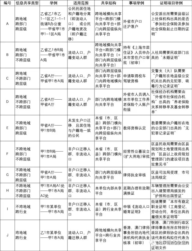 下面以上海市市民辦事項(xiàng)目為樣本,分別從適用范圍、共享結(jié)構(gòu)、共享難度、事項(xiàng)舉例四方面,對(duì)10類信息共享進(jìn)行說(shuō)明(參見(jiàn)表1)。