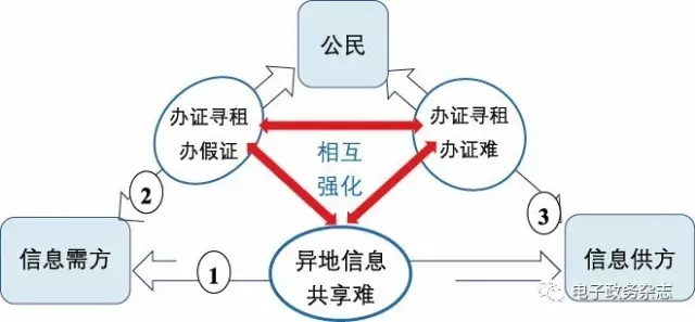 在這樣的態(tài)勢(shì)下,信息生態(tài)鏈產(chǎn)生了兩個(gè)副產(chǎn)品:權(quán)力尋租和辦假證。權(quán)力尋租源于信息供方和需方相對(duì)于公民的信息生態(tài)位優(yōu)勢(shì),為了建立信息鏈,實(shí)現(xiàn)信息流動(dòng),公民被迫支付信息租金[4]。辦假證是在信息生態(tài)鏈的環(huán)節(jié)③不通暢的情況下,為公民構(gòu)建一個(gè)虛擬的完整信息鏈而滋生的違法活動(dòng)。不僅如此,由于經(jīng)濟(jì)利益的驅(qū)使,兩個(gè)副產(chǎn)品和信息共享難之間存在相互強(qiáng)化的關(guān)系,即“共享難→辦證尋租→辦假證→共享需求降低→共享更難……”。