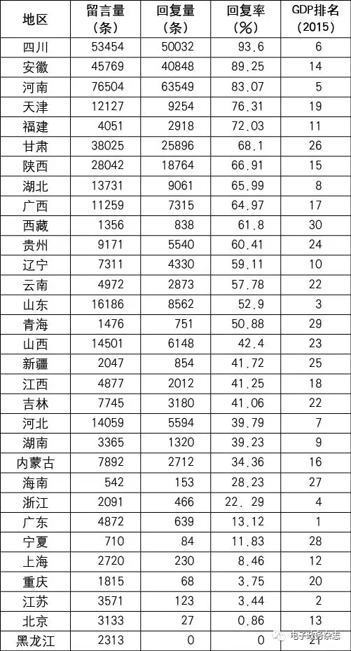 表3 人民網(wǎng)地方領(lǐng)導(dǎo)留言板留言量、回復(fù)量、回復(fù)率及GDP統(tǒng)計(jì)[21]