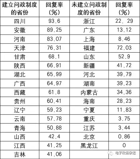 從表5統(tǒng)計(jì)可見(jiàn),建立問(wèn)政制度的省份回復(fù)率平均值為56.15%,未建立問(wèn)政制度的省份回復(fù)率平均值為27.35%,兩者相差一半,說(shuō)明網(wǎng)絡(luò)問(wèn)政制度建立與否與公民網(wǎng)絡(luò)問(wèn)政呈正相關(guān)關(guān)系。