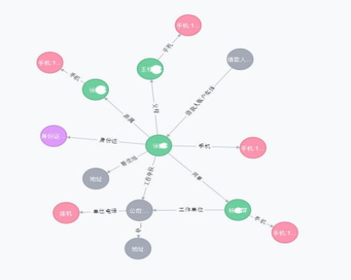 圖數(shù)據(jù)庫能通過“實體”和“關(guān)系”這種簡單直觀的描述方法來表述現(xiàn)實世界中錯綜復(fù)雜的關(guān)聯(lián)關(guān)系。它可以提供逐層挖掘的方式,引導(dǎo)逐步深入分析各種關(guān)系;還可以快速呈現(xiàn)實體之間最新的關(guān)系變化,積累更新的知識和經(jīng)驗;也可以清晰地呈現(xiàn)復(fù)雜關(guān)系間的聯(lián)絡(luò)線索,為判斷事件來龍去脈提供有效引導(dǎo)。此處,以恒昌的客戶為例,參考圖1中的客戶徐某(因數(shù)據(jù)安全的原因,部分信息作了涂抹,并對原有圖結(jié)構(gòu)進行了簡化),如果僅考慮該客戶自己填寫的信息,雖然能看到一度關(guān)聯(lián)信息,但完全看不出該結(jié)構(gòu)會有什么問題,也無法進行深入調(diào)查。