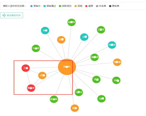 當(dāng)關(guān)聯(lián)信息得到補充(相對于原進件聯(lián)系人,補充了同事、鄰居、親屬、朋友等關(guān)系,還基于用戶授權(quán)數(shù)據(jù)進行了深度擴展)后,暫不考慮物品(如手機號、銀行賬號、地址等),僅考慮自然人,獲取徐某二度關(guān)系內(nèi)同時在恒昌網(wǎng)貸平臺有借款行為的用戶,得到圖2(基于同樣原因數(shù)據(jù)有涂抹及簡化)的結(jié)果。該圖每一個圓都代表一位恒昌客戶,圖頂部的狀態(tài)說明了客戶當(dāng)前所處狀態(tài)。觀察左下角以徐某為中心的四個客戶(已用紅框標(biāo)出),他們剛好是所呈現(xiàn)圖的最大完全子圖,符合圖論中團的定義。再看除徐某外的三個客戶:兩個逾期、一個被拒。如果徐某是新入圖數(shù)據(jù)庫的借款人,從數(shù)學(xué)模型的角度看,幾乎可以直接判定拒絕。因為符合這種狀態(tài)的團,是欺詐團伙或是組團代辦的幾率非常大。