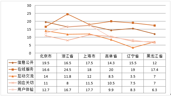 根據(jù)2016年評估結(jié)果顯示,省級網(wǎng)站2016年平均得分為61.47分。其中,北京市政府網(wǎng)站排名第一,總分78.8分;浙江省政府網(wǎng)站排名第二,總分77.5分;上海市政府網(wǎng)站排名第三,總分76.7分。14家網(wǎng)站得分超過平均分,占總數(shù)的45.16%。根據(jù)評估結(jié)果來看,東北區(qū)域整體建設(shè)水平不突出,吉林省、遼寧省及黑龍江省分別位于第13名、第24名和第26名,得分依次為63.2分、53.8分、48.7分,僅吉林省政府網(wǎng)站得分超過平均分,處于中游位置,遼寧省和黑龍江省仍處于靠后名次。值得注意的是,本次評估吉林省和遼寧省政府網(wǎng)站均比去年進(jìn)步了3位,尤其是在信息公開的力度和行政審批事項(xiàng)網(wǎng)上辦理一體化、人性化服務(wù)、服務(wù)實(shí)用及便捷性方面都取得了明顯的進(jìn)步。