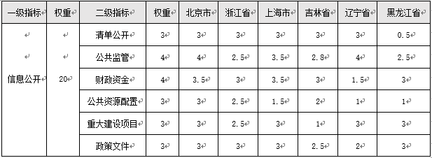 信息公開方面,全國平均績效得分為15.57分,得分率為61.47%,北、浙、上平均績效得分為17.83分,東北區(qū)域省級政府信息公開平均績效得分為13.93分。2016年省級政府門戶網(wǎng)站評估得分統(tǒng)計(jì)表顯示,東北區(qū)域整體情況較好,較去年有了明顯提升,但三省網(wǎng)站均存在短板,在個(gè)別二級指標(biāo)上扣分嚴(yán)重,例如黑龍江省政府網(wǎng)站在權(quán)責(zé)清單公開上失分較多;吉林省政府網(wǎng)站在重大建設(shè)項(xiàng)目指標(biāo)上失分較多;遼寧省政府網(wǎng)站在公共資源配置指標(biāo)上失分較多,如表1。