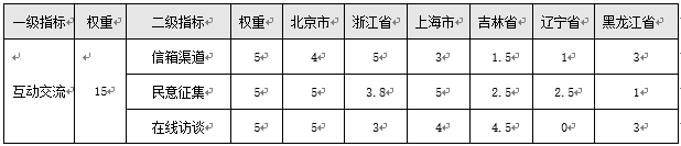 互動(dòng)交流方面,全國平均績效得分為9分,得分率為60.02%,北、浙、上平均績效得分為12.6分,東北區(qū)域省級政府互動(dòng)交流平均績效得分為6.33分。從下表可以看出,北、浙、上三家網(wǎng)站在信箱渠道、民意征集、在線訪談上得分較為平穩(wěn);吉林省政府網(wǎng)站經(jīng)過改版后,在互動(dòng)交流渠道建設(shè)和反饋能力上進(jìn)步較大,完善答復(fù)反饋機(jī)制,切實(shí)提高政府公信力;黑龍江、遼寧兩省在互動(dòng)交流上發(fā)展相對不均衡,短板較明顯,例如遼寧省政府網(wǎng)站未設(shè)置在線訪談渠道,該項(xiàng)未得分,互動(dòng)交流建設(shè)仍有較大進(jìn)步空間。