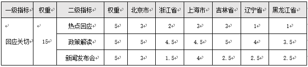 回應(yīng)關(guān)切方面,全國平均績效得分為8.05分,得分率為53.66%,北、浙、上平均績效得分為10.17分,東北區(qū)域省級政府回應(yīng)關(guān)切平均績效得分為8.3分。我國省級政府網(wǎng)站在回應(yīng)關(guān)切指標(biāo)上未達(dá)到及格水平,全國范圍內(nèi)整體水平均較低。東北區(qū)域政府網(wǎng)站在該項(xiàng)指標(biāo)上失分較多,各家單位在及時(shí)回應(yīng)社會熱點(diǎn)事件、引導(dǎo)網(wǎng)絡(luò)輿情方面還有較大的提升空間。