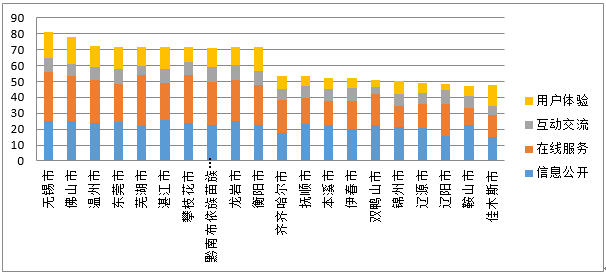 2016年地市級網(wǎng)站評估指標(biāo)包括信息公開、在線服務(wù)、互動(dòng)交流與用戶體驗(yàn)四大類指標(biāo)。本次評估平均分得分為50.38分,有158個(gè)單位總得分超過整體平均得分,占比52.84%,70分以上的單位有16個(gè),僅占5.35%,東北三省無單位入選;30分以下單位有22個(gè),占比7.36%,東北三省3家單位入選。其中,齊齊哈爾市位列東北區(qū)域排名第一,占總排名135位,隨后依次是撫順市、本溪市等政府網(wǎng)站。為探討東北區(qū)域地市級網(wǎng)站發(fā)展現(xiàn)狀,選取2016年地市級網(wǎng)站建設(shè)總體情況排名前十名(無錫市、佛山市、溫州市、東莞市、蕪湖市、湛江市、攀枝花市、黔南布依族苗族自治州、龍巖市、衡陽市)與東北區(qū)域前十名(齊齊哈爾市、撫順市、本溪市、伊春市、雙鴨山市、錦州市、遼源市、遼陽市、鞍山市、佳木斯市)相比,制成下圖。