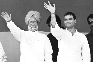 39歲的國(guó)大黨秘書長(zhǎng)拉胡爾·甘地11日首次與總理曼莫漢·辛格一同登臺(tái)拉票。前者贊揚(yáng)辛格是旁遮普邦和整個(gè)印度的驕傲。
