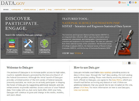 Data.gov網(wǎng)站屬于奧巴馬開放政府計劃的一環(huán),在這個網(wǎng)站中公開了最原始的美國政府信息,未經(jīng)過任何過濾。只要符合美國信息公開法規(guī)的開放條件,都以原始數(shù)據(jù)數(shù)據(jù)的形式免費提供,涵蓋了美國的人口特征統(tǒng)計數(shù)據(jù)、GIS地理信息,以及教育、能源、地域、健康、法令相關(guān)主題的政府信息等。