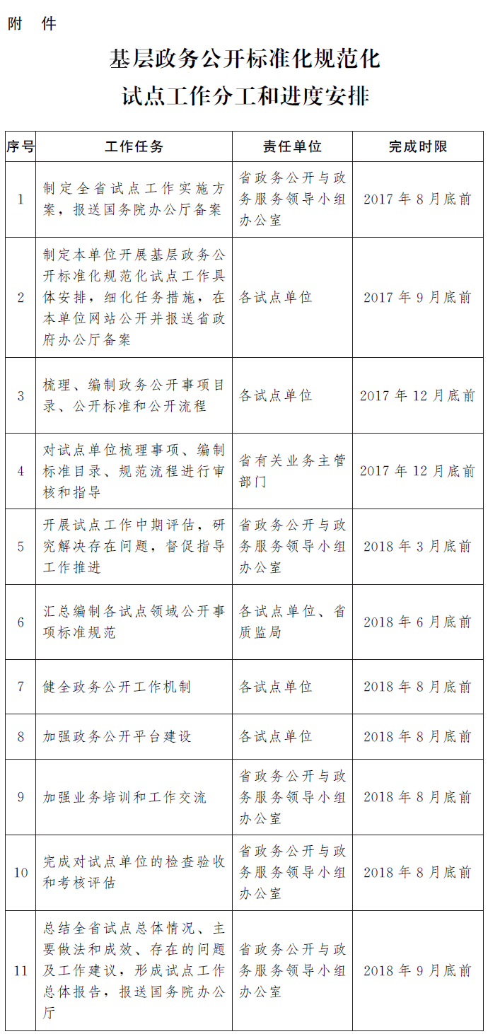 附件:基層政務(wù)公開標(biāo)準(zhǔn)化規(guī)范化試點工作分工和進(jìn)度安排