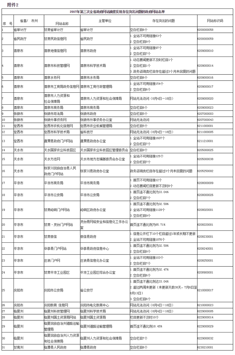 ?。ㄒ唬┎糠志W(wǎng)站依然存在單項否決類“嚴重問題”。此次抽查檢查發(fā)現(xiàn),部分網(wǎng)站仍然存在空白欄目數(shù)超過5個、首頁不連通比例超過5%、網(wǎng)站無法正常訪問等單項否決類“嚴重問題”,有些網(wǎng)站全站不可用鏈接超過100個。省審計廳網(wǎng)、省民政信息網(wǎng)、天水方志網(wǎng)、張掖市司法局網(wǎng)等空白欄目數(shù)超過5個,張掖市外事僑務辦公室網(wǎng)、酒泉市人力資源和社會保障局網(wǎng)、慶陽教育信息網(wǎng)、定西市科學技術局網(wǎng)、臨夏州科技管理網(wǎng)等網(wǎng)站抽查期間無法訪問;甘肅崆峒、甘肅·崇信、通渭縣人民政府等門戶網(wǎng)站全站不可用鏈接超過100個,玉門市人民政府公眾信息網(wǎng)全站不可用鏈接高達2000多個(見附件2)。