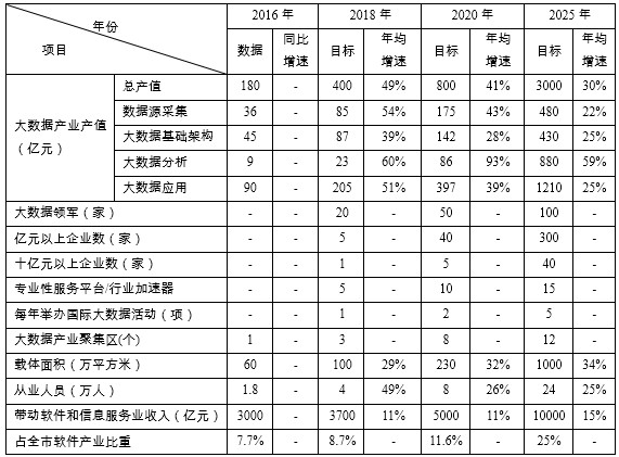 到2025年,建成國內(nèi)領先、國際一流的大數(shù)據(jù)產(chǎn)業(yè)發(fā)展支撐體系、供給體系和市場體系,適應大數(shù)據(jù)產(chǎn)業(yè)發(fā)展的生態(tài)環(huán)境進一步優(yōu)化,產(chǎn)業(yè)要素集聚度不斷提高,大數(shù)據(jù)自主創(chuàng)新深入推進,集聚一批具有行業(yè)影響力的領軍企業(yè),大數(shù)據(jù)產(chǎn)品、服務和解決方案供給能力國內(nèi)領先,大數(shù)據(jù)產(chǎn)品及服務交易保持活躍,具有國際影響力的大數(shù)據(jù)市場集散中心地位基本確立,“西部數(shù)都”品牌影響力大幅提升,全市大數(shù)據(jù)產(chǎn)業(yè)產(chǎn)值達到3000億元,帶動軟件和信息服務業(yè)收入超過1萬億元。