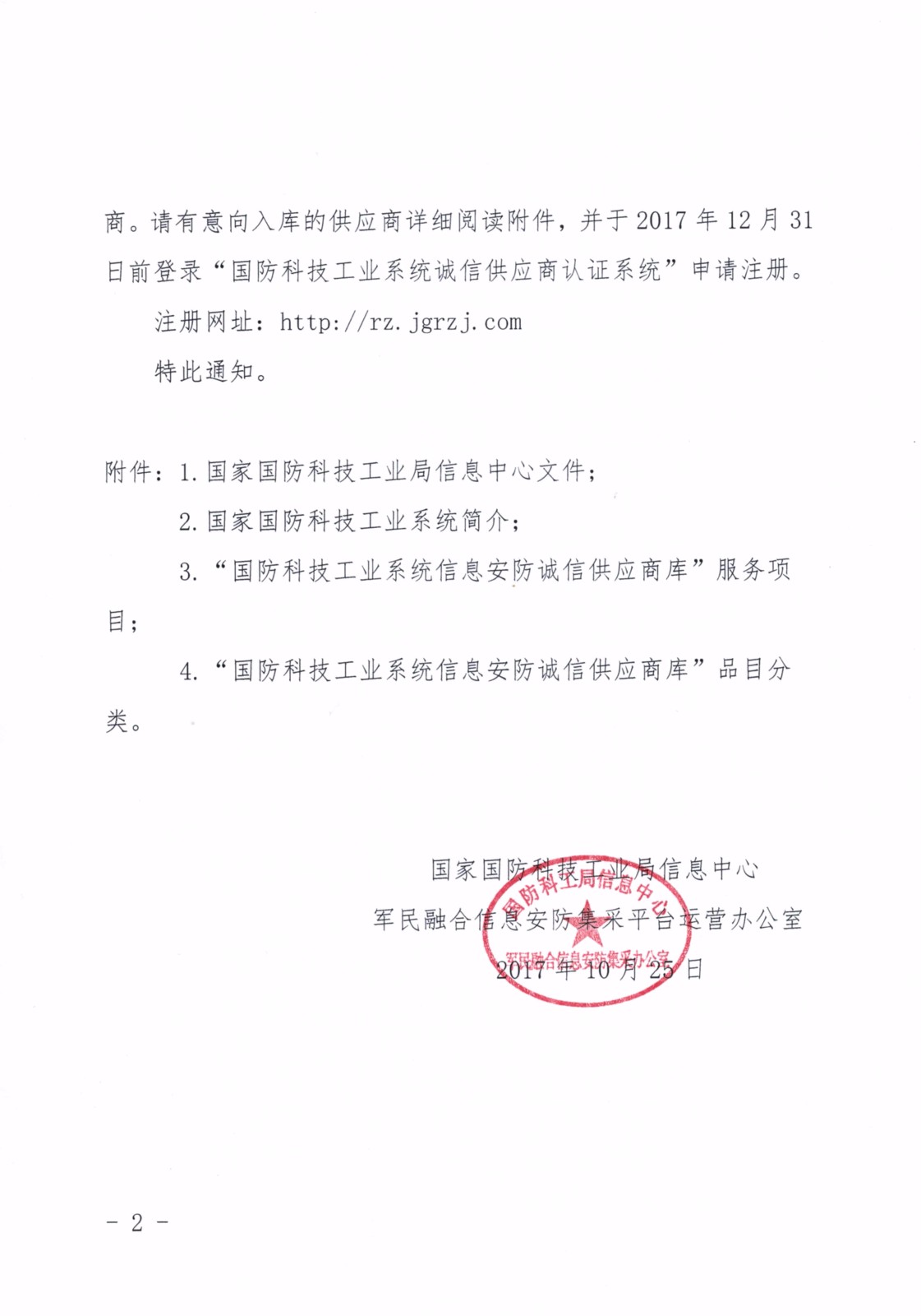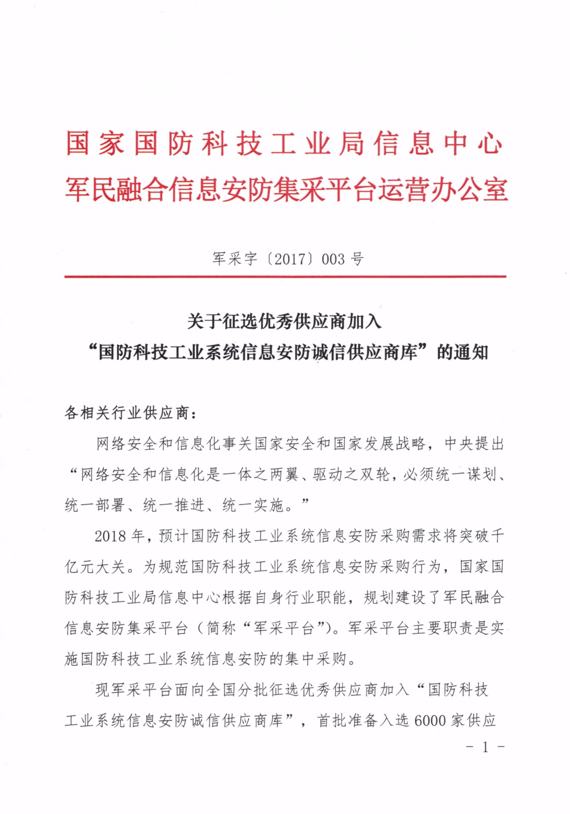 關(guān)于征選優(yōu)秀供應(yīng)商加入“國防科技工業(yè)系統(tǒng)信息安防誠信供應(yīng)商庫”的通知