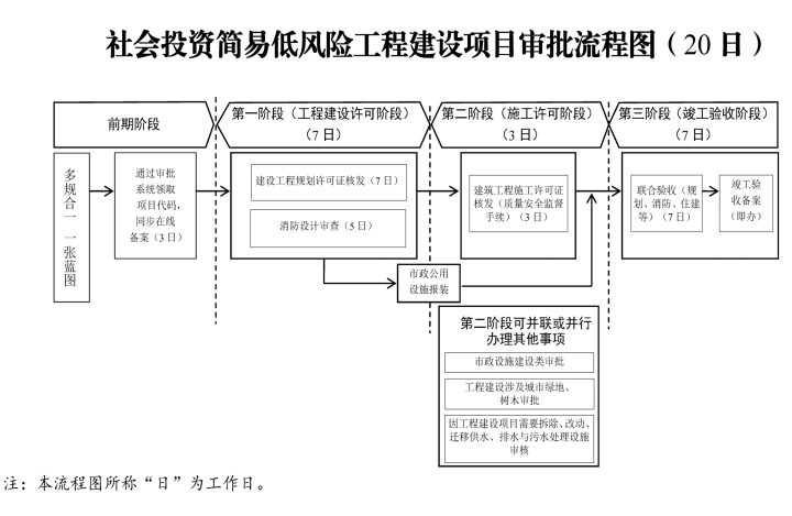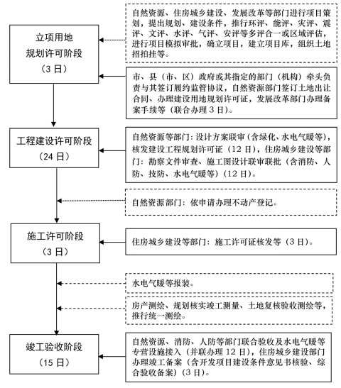 注: 1. 圖中虛線部分表示由政府部門、單位提前介入事項(xiàng),有關(guān)部門、單位并行辦理但不計(jì)入主流程審批(審查)時(shí)間的事項(xiàng)。建設(shè)單位按要求整改時(shí)間,不計(jì)入審批時(shí)間。
