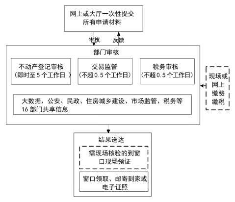 不動(dòng)產(chǎn)登記機(jī)構(gòu)按照國家有關(guān)規(guī)定,加強(qiáng)部門協(xié)作,實(shí)行不動(dòng)產(chǎn)登記、交易和繳稅一窗受理、并行辦理,壓縮辦理時(shí)間,降低辦理成本。推進(jìn)網(wǎng)上繳稅或委托不動(dòng)產(chǎn)登記機(jī)構(gòu)代為辦理收繳稅款,進(jìn)一步減少環(huán)節(jié)。