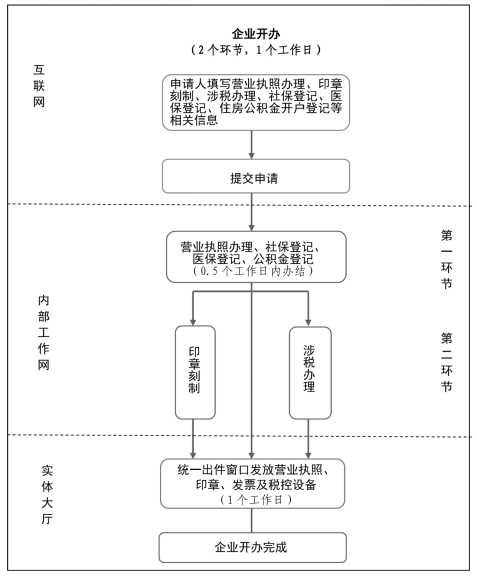 1.強(qiáng)化流程再造。各相關(guān)部門要按照“手續(xù)更簡,環(huán)節(jié)更少,成本更低,效率更高”原則,對(duì)各自的相關(guān)業(yè)務(wù)系統(tǒng)進(jìn)行改造重塑,將必要的后續(xù)事項(xiàng)與營業(yè)執(zhí)照申領(lǐng)合并,構(gòu)建企業(yè)網(wǎng)上申報(bào)、部門網(wǎng)上審批、證章和稅控設(shè)備免費(fèi)寄遞“零見面”的企業(yè)開辦服務(wù)新流程。申請(qǐng)人一次登錄企業(yè)開辦“一窗通”系統(tǒng),一表填報(bào)與營業(yè)執(zhí)照申領(lǐng)、印章刻制、涉稅辦理、社保登記、醫(yī)保登記、住房公積金開戶登記等相關(guān)信息,實(shí)現(xiàn)在線申請(qǐng)、在線簽名、在線選擇預(yù)約開戶銀行網(wǎng)點(diǎn)。相關(guān)部門在規(guī)定時(shí)間內(nèi)完成網(wǎng)上審批,審批結(jié)果后臺(tái)流轉(zhuǎn),統(tǒng)一出件窗口發(fā)放營業(yè)執(zhí)照、印章、發(fā)票及稅控設(shè)備。