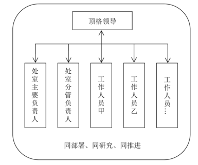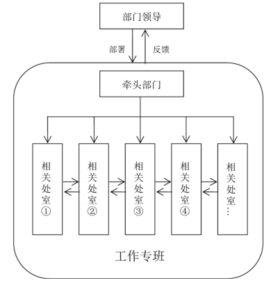 2.建立工作專班制。對(duì)于涉及多個(gè)處室的重要工作,建立相關(guān)處室共同參加的工作專班。部門主要負(fù)責(zé)同志或分管負(fù)責(zé)同志指定一個(gè)處室牽頭,明確任務(wù)分工,統(tǒng)籌人員力量,實(shí)行“一口對(duì)外”。