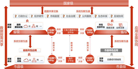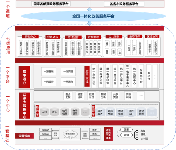 一個中心:建設(shè)江淮大數(shù)據(jù)中心,搭建省級總平臺、行業(yè)部門分平臺、各市子平臺的平臺框架體系,匯聚政務(wù)、社會、經(jīng)濟等數(shù)據(jù)資源,為“數(shù)字政府”建設(shè)提供數(shù)據(jù)支撐。
