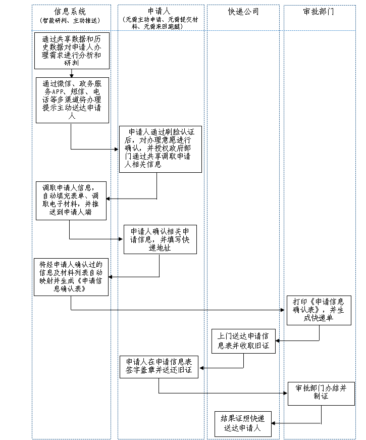 (五)申報(bào)信息確認(rèn)。信息系統(tǒng)智能獲取服務(wù)對象的相關(guān)信息,自動(dòng)填充表單并向服務(wù)對象推送申請材料。服務(wù)對象對信息和材料進(jìn)行確認(rèn),并選擇舊證回收方式和辦理結(jié)果送達(dá)方式。