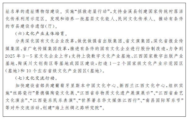 高標(biāo)準(zhǔn)建設(shè)景德鎮(zhèn)國(guó)家陶瓷文化傳承創(chuàng)新試驗(yàn)區(qū),努力打造“兩地一中心”兩地一中心:國(guó)家陶瓷文化保護(hù)傳承創(chuàng)新基地、世界著名陶瓷文化旅游目的地、國(guó)際陶瓷文化交流合作交易中心。。全面推進(jìn)南昌漢代?;韬顕?guó)遺址、景德鎮(zhèn)御窯廠遺址等國(guó)家考古遺址公園建設(shè),構(gòu)建更具江西特色的考古遺址公園體系和遺址博物館群。深入開(kāi)展江西歷史文化專(zhuān)題研究闡釋?zhuān)七M(jìn)書(shū)院文化、稻作文化、戲曲文化、中醫(yī)藥文化、陽(yáng)明文化等特色歷史文化傳承創(chuàng)新,推動(dòng)婺源徽州文化、贛南客家文化、景德鎮(zhèn)陶瓷文化、吉安廬陵文化、撫州戲曲文化等文化生態(tài)保護(hù)區(qū)(實(shí)驗(yàn)區(qū))建設(shè)。加強(qiáng)世界文化遺產(chǎn)、重點(diǎn)文物保護(hù)單位、歷史文化名城名鎮(zhèn)名村、傳統(tǒng)村落保護(hù)和利用。強(qiáng)化非物質(zhì)文化遺產(chǎn)系統(tǒng)性保護(hù)。加強(qiáng)優(yōu)秀傳統(tǒng)手工藝保護(hù)和傳承。開(kāi)展贛鄱文化資源普查,深化古籍整理研究。加強(qiáng)地方志工作。啟動(dòng)《江右文庫(kù)》編纂工程。